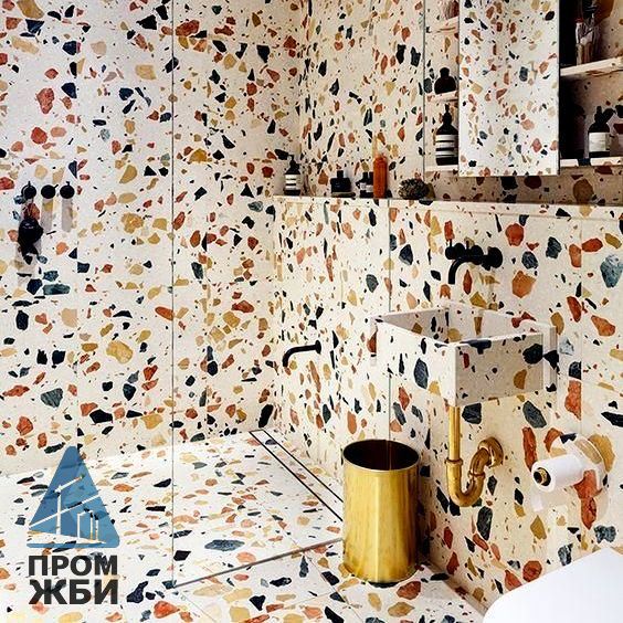 Обстановка для санузла, выдержанная в едином стиле помогает сделать интерьер помещения гармоничным, а использование нетипичных материалов – оригинальным. Санузел в стиле терраццо на сегодня – довольно необычное решение, но популярность таких изделий для санитарных помещений становится в больше.